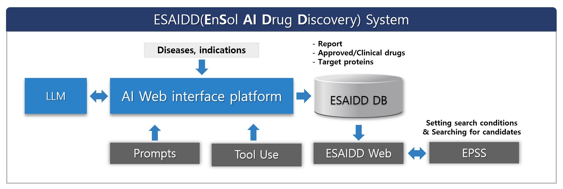 ESAIDD(EnSol AI Drug Discovery)는 기존 KISDD 플랫폼과 EPDS 시스템을 통합하되 인공지능 대규모언어모델(LLM) 기술을 접목하여 성공가능성이 높은 좋은 후보물질을 획기적으로 빠른 시간에 발굴할 수 있는 시스템입니다.
